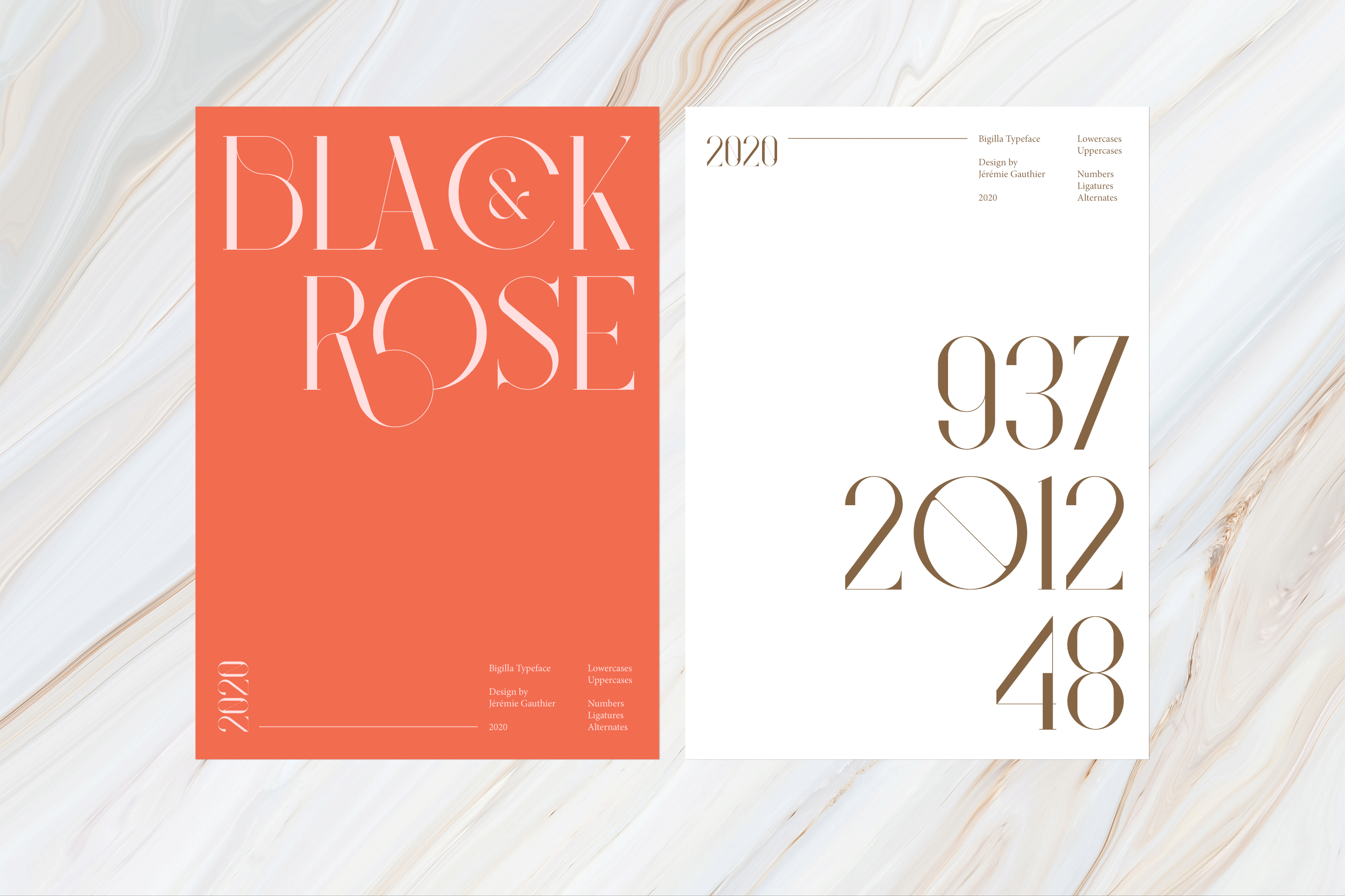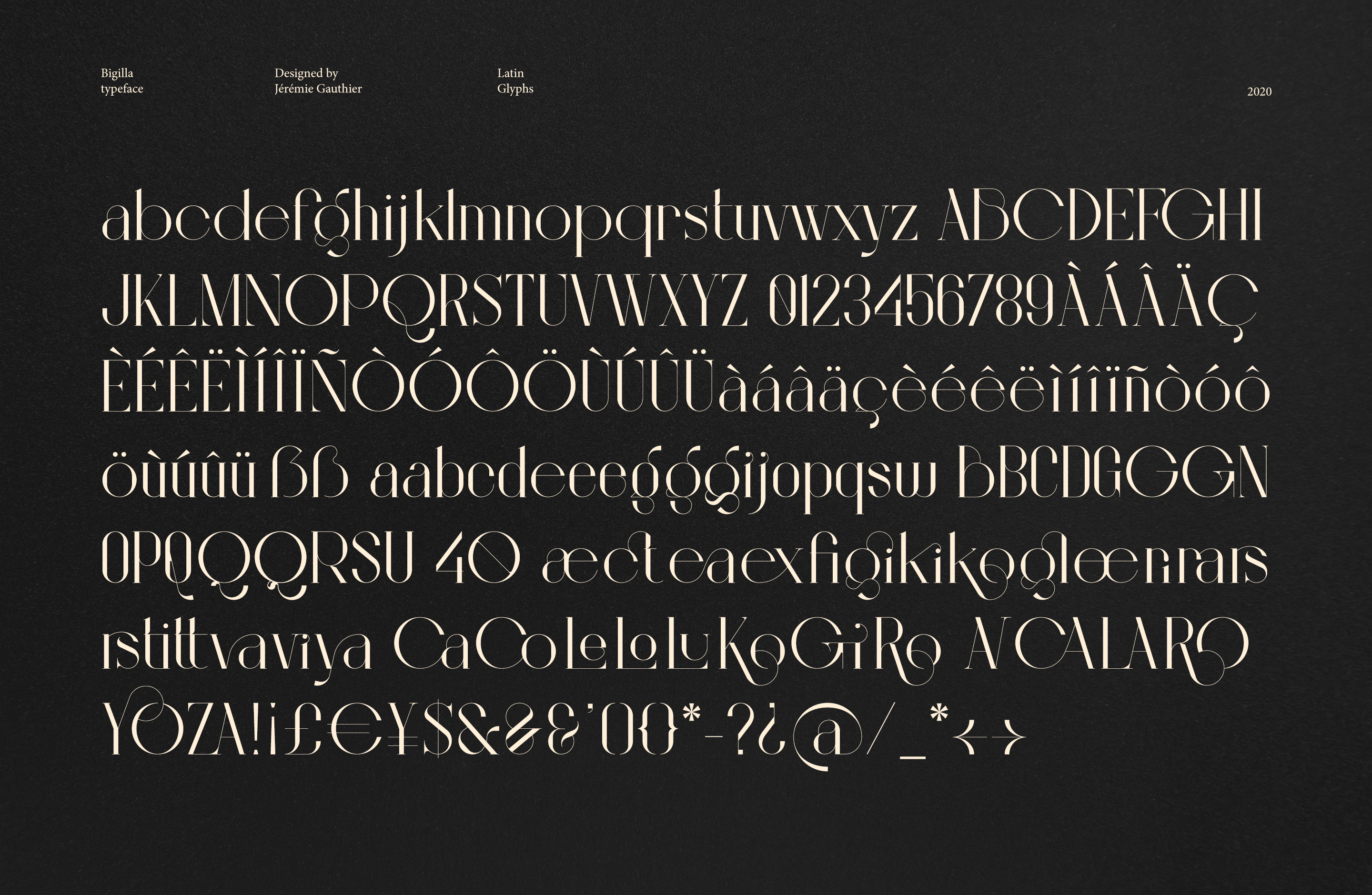 Bigilla™ is a display serif typeface with 2 font weights (Regular-Bold) that include many ligatures and alternates.